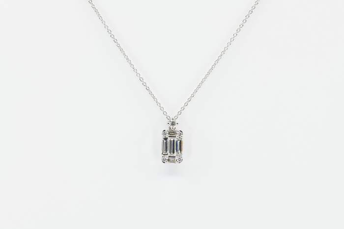 La montatura in oro bianco è molto semplice, ma piena di segreti. Realizzata in maniera impeccabile dagli artigiani Crivelli, la collana si fa notare soprattutto per la sua luminosità. La combinazione di diamanti taglio “baguette” e “tondo brillante” fa rimbalzare la luce in maniera splendida. Un gioiello davvero super-luminoso.