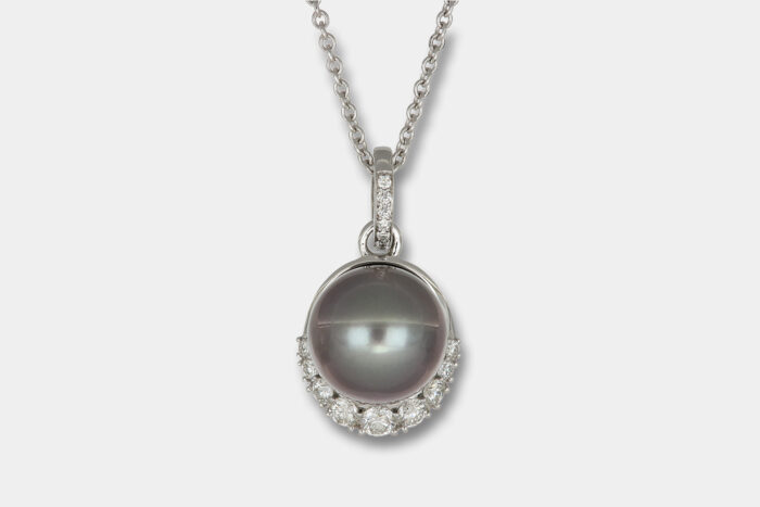 La perla di Tahiti è in perfetta armonia con il pavé di diamanti che lo circonda. Diamanti dalla caratura variabile, ma tutti dal taglio tondo brillante e dal colore “G”. La purezza di questi diamanti è misurata invece con la sigla “SI1”. Delicati e luminosi come pochi, quindi. E di grandissimo effetto.
