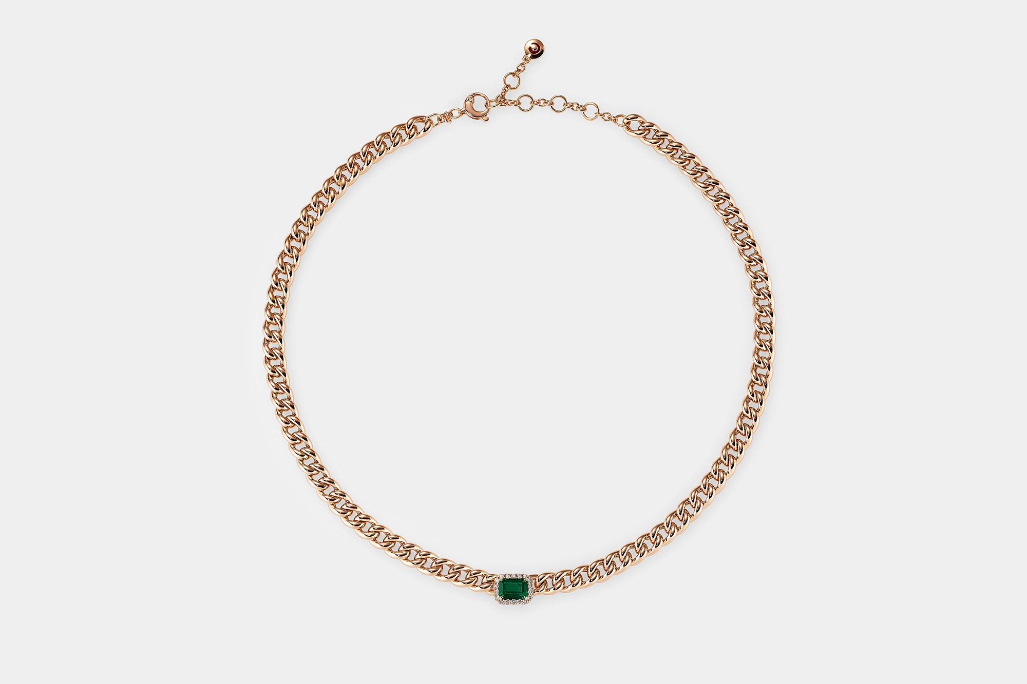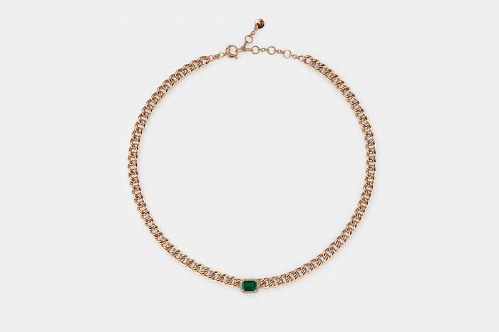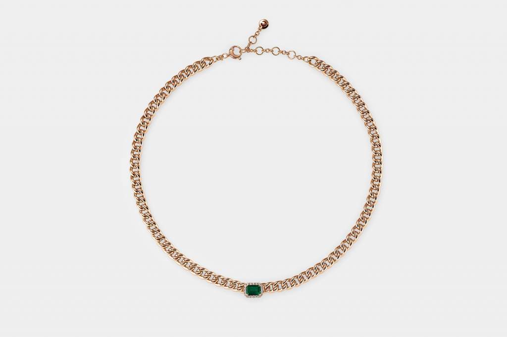 La parte che attira di più l’attenzione è però l’elemento centrale. Realizzato all’interno del girocollo stesso, su questo spunta un bellissimo smeraldo taglio ottagonale. E tutt’attorno alla pietra, un delizioso pavé di diamanti bianchi.