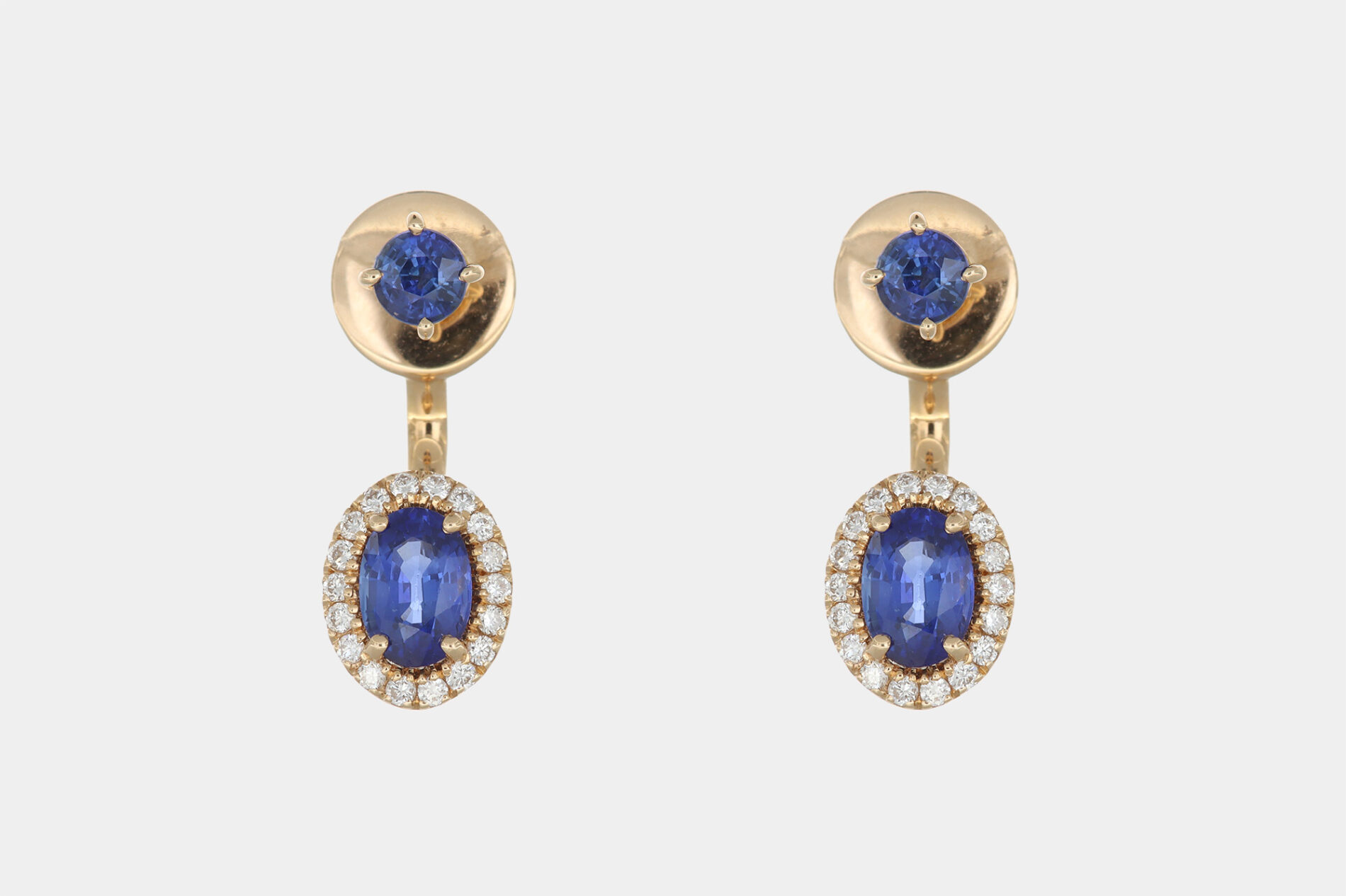 Indovinata al 100% è la scelta degli zaffiri taglio “ovale”, entrambi selezionati per le loro caratteristiche peculiari. Incastonati perfettamente al centro di una montatura che riprende le forme delle pietre centrali. Sono invece taglio “tondo brillante” i due zaffiri sulla “punta” del gioiello, anch’essi selezionati per dare colore e risalto alla parte che appoggia sul lobo.