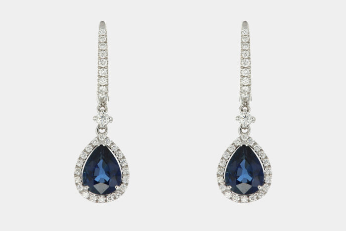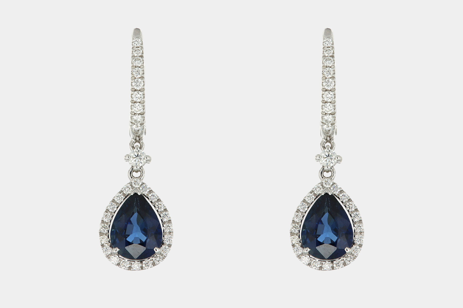Indovinata al 100% è la scelta degli zaffiri taglio goccia, entrambi selezionati per le loro caratteristiche peculiari. E se osservate con attenzione, noterete che su ognuno di essi vi è un piccolo diamante che “sorregge” il pendente. Una soluzione davvero deliziosa.