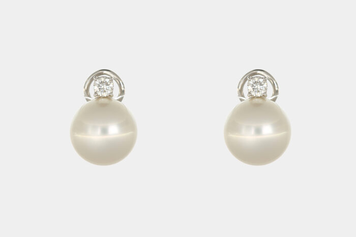 Grande attenzione è stata riposta nella scelta dei diamanti inseriti su ognuno di questi orecchini. Come potete notare, su ogni singolo orecchino è posizionato appunto un diamante taglio “tondo brillante”, selezionato per dare più luce alla perla. La montatura in oro bianco “sorregge” il tutto, ed è integrata nella chiusura detta “a monachella”. Quindi il gioiello sarà molto portabile e leggero.