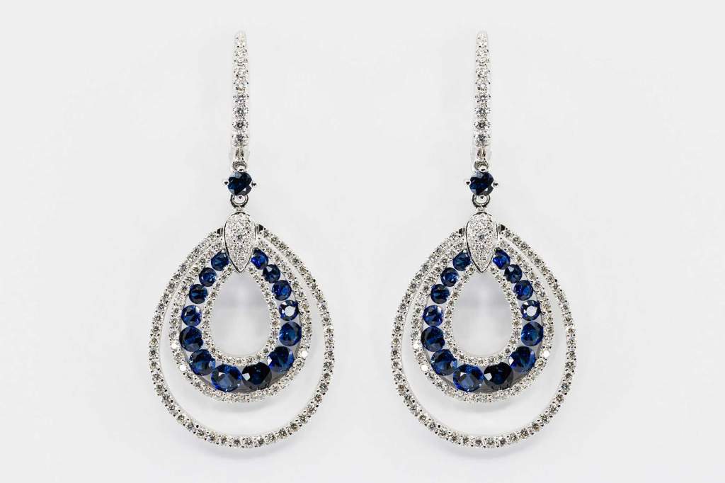 Ma come dicevamo, è la montatura che fa da protagonista al gioiello. Gli orecchini prendono la loro forma proprio dalla base a forma di goccia con pavè interno di diamanti. E da lì, il gioiello si allarga sviluppando ulteriori tre bellissimi pavè di diamanti ed uno di zaffiri blu. Sono zaffiri blu anche le gemme sulla contromaglia dei pendenti, che sorreggono virtualmente questa splendida creazione.