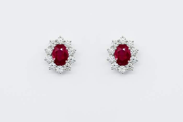I rubini taglio ovale sono in perfetta armonia con i pavé di diamanti che li circondano. Diamanti dalla caratura variabile in base al modello, dal taglio tondo brillante e dalla purezza contraddistinta dalla sigla “Si1”. Il colore varia invece in base al modello scelto, ma parliamo comunque di colorazioni molto alte come “F” e “G”. Delicati e luminosi come pochi, quindi. E di grandissimo effetto.