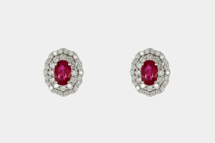 La montatura in oro bianco è detta “halo”, ed ha lo scopo di esaltare la pietra centrale. Realizzati in maniera impeccabile dagli artigiani Crivelli, gli orecchini si fanno notare appunto per il colore. Le pietre sono infatti due bellissimi rubini “taglio ovale” dalle caratteristiche eccezionali. Sia per colore che per brillantezza. Ed indossandoli si capisce subito che sono gemme veramente speciali.