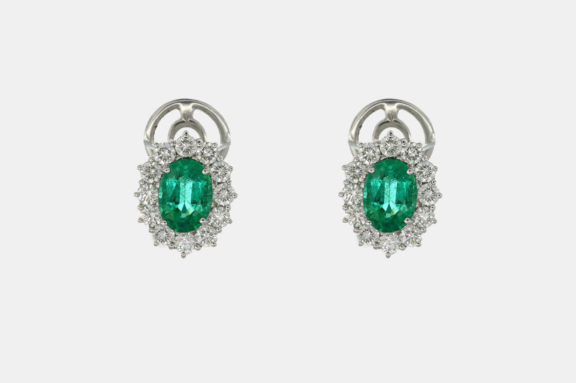 Gli smeraldi taglio “ovale” hanno una caratura totale di 1.50 ct., e sono in perfetta armonia con i pavé di diamanti che li circondano. Diamanti dalla caratura totale di 0.82 ct., dal taglio tondo brillante e dal colore “F”. La purezza di questi diamanti è misurata invece con la sigla “SI1”. Delicati e luminosi come pochi, quindi. E di grandissimo effetto.
