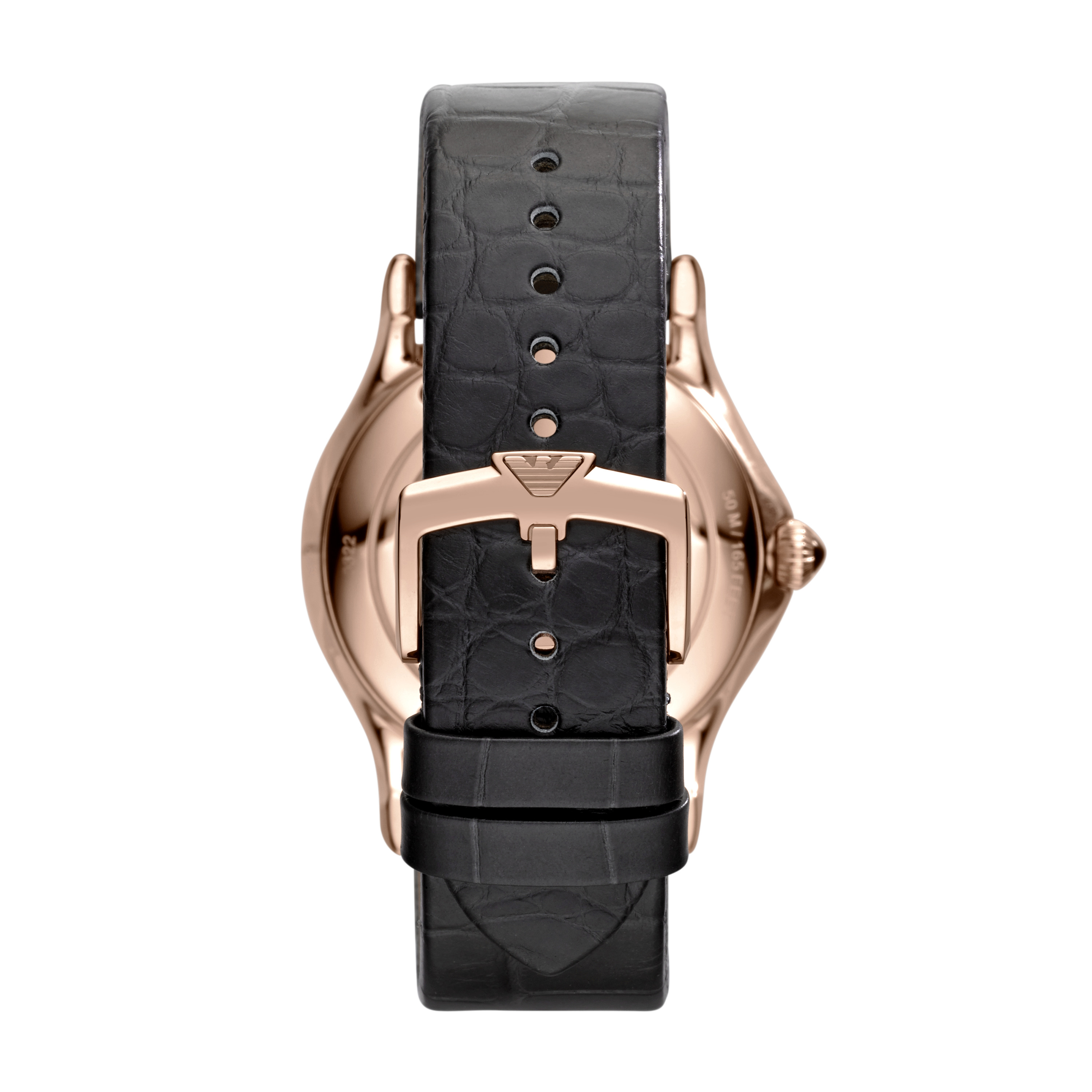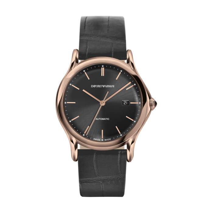Colpisce molto il quadrante, realizzato in color grigio scuro effetto “Sunray”, mentre il vetro zaffiro antiriflesso della cassa vi assicurerà la perfetta leggibilità dell’ora. Meravigliose le lancette “dauphine” color oro rosa e gli indici a bastone, molto eleganti e “retrò”. Completa infine il tutto il cinturino in pelle di alligatore color grigio scuro con chiusura déployante dorata realizzato nelle boutique italiane di Emporio Armani.