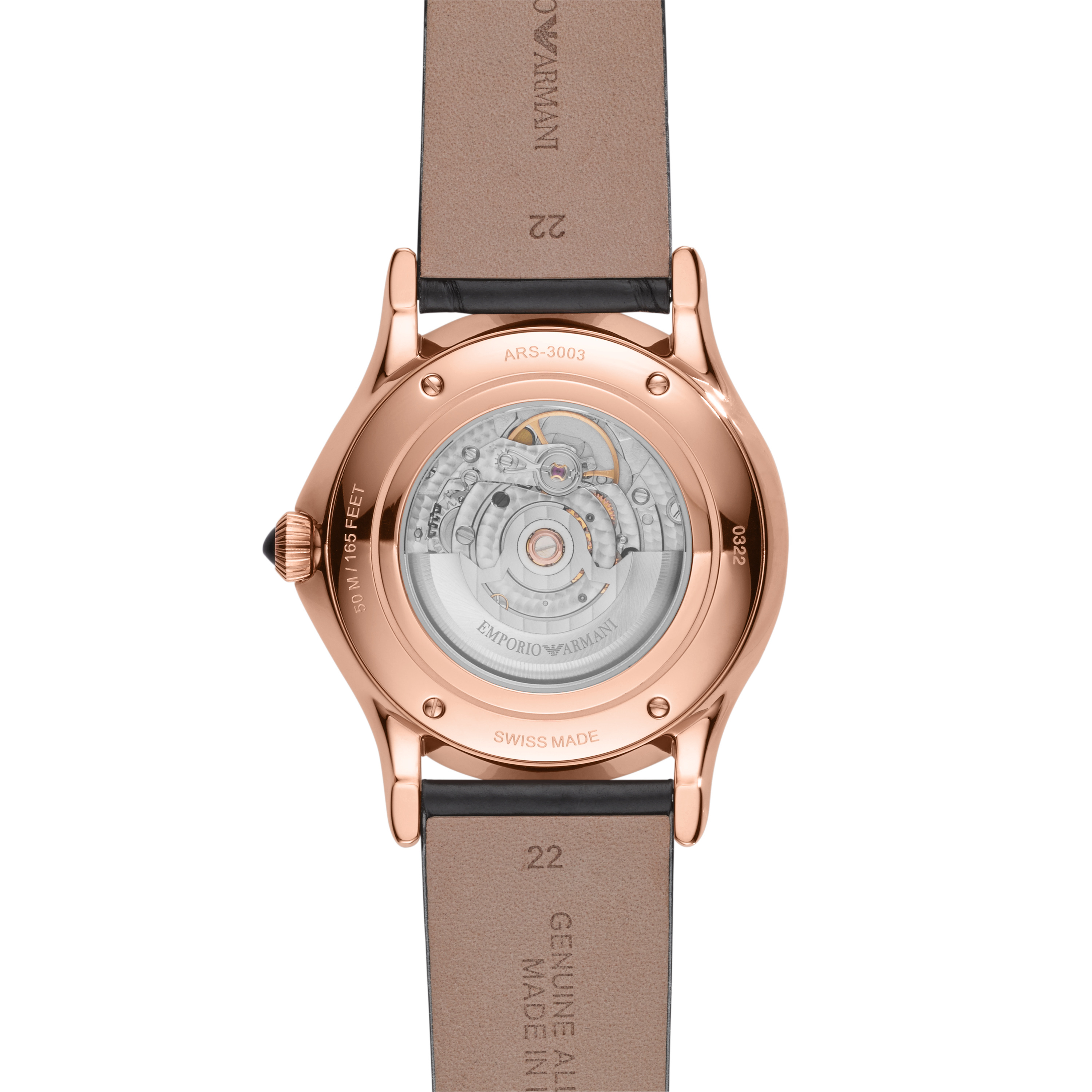 L’Emporio Armani Swiss Made ARS3003 è esattamente questo. Dal diametro di 42mm per uno spessore di 11,25mm, la cassa ha una misura che si adatta perfettamente a qualsiasi polso. Uno standard di vestibilità molto gradito. Ed il color oro rosa dell’acciaio INOX PVD in cui è realizzata ne esalta la bellezza.