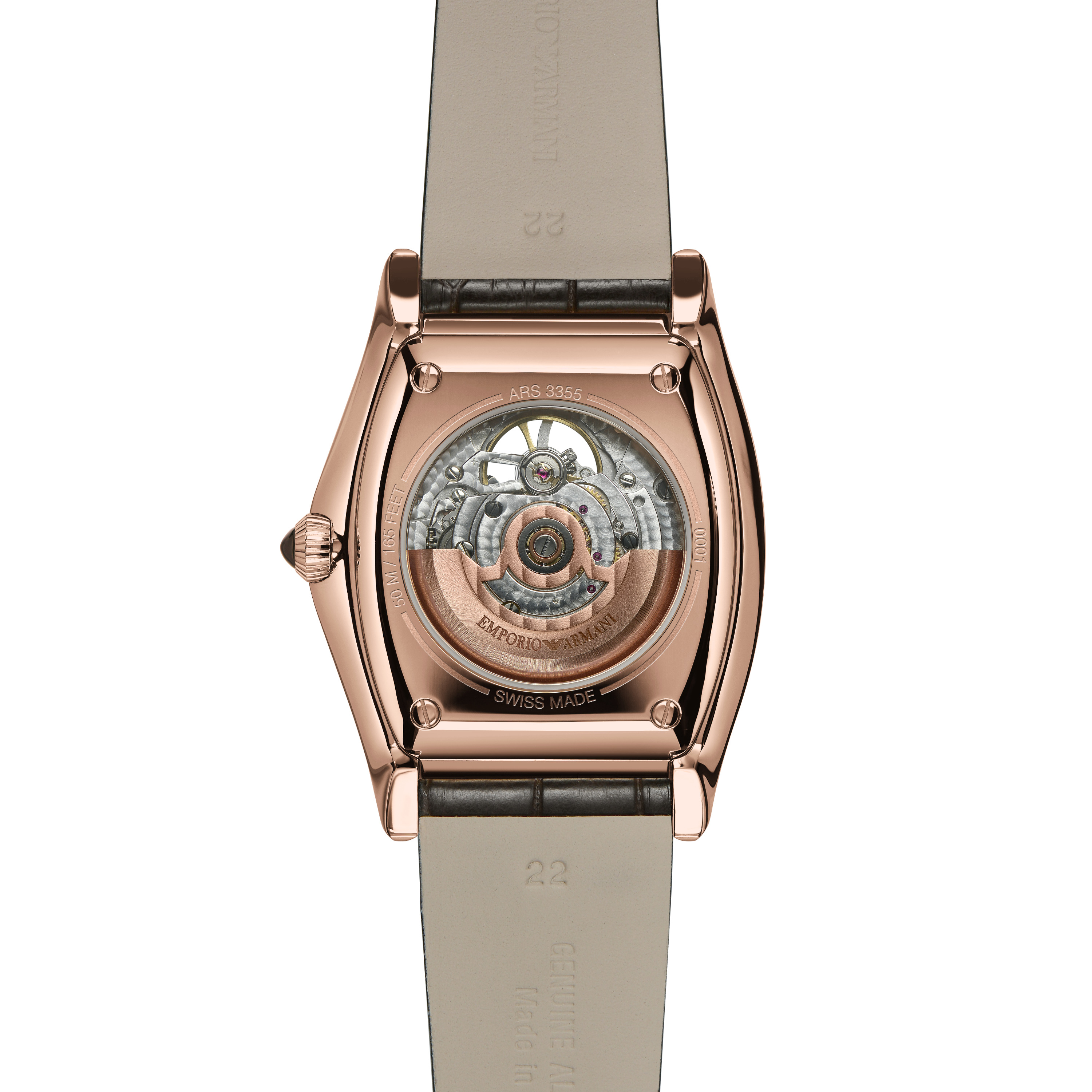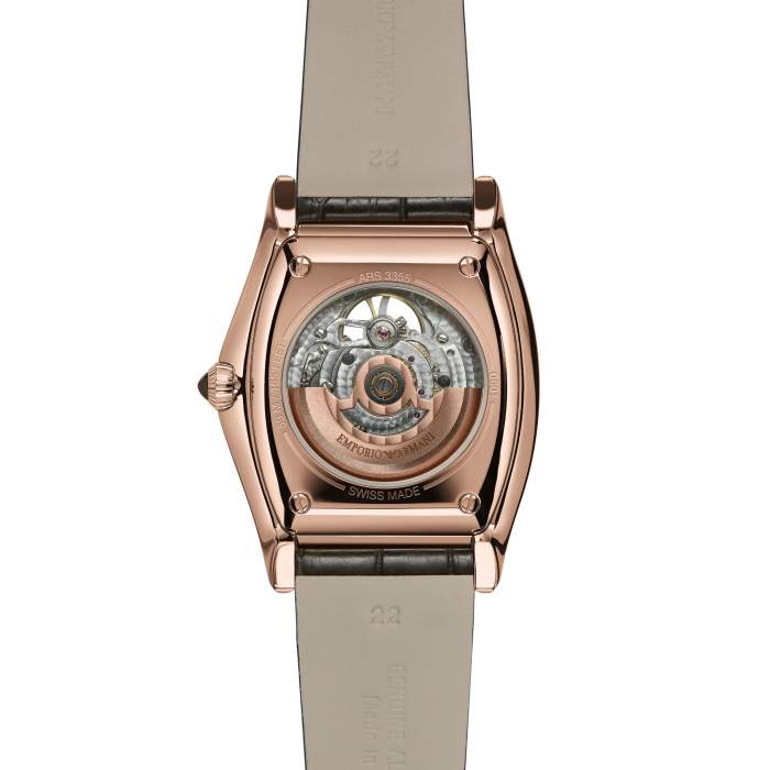 Il vero pezzo forte di questo Emporio Armani Swiss Made ARS3355 ĆØ però il quadrante. Realizzato con finitura “sunray” color marrone, nel quadrante figura una finestra che mostra il calibro STP 5-15 in movimento. Un calibro automatico realizzato dalla Swiss Tecnology Production direttamente in Svizzera, ovviamente. Preciso ed affidabile, potete ammirare l’SPT 5-15 in movimento anche dal vetro zaffiro posto sul retro della cassa.