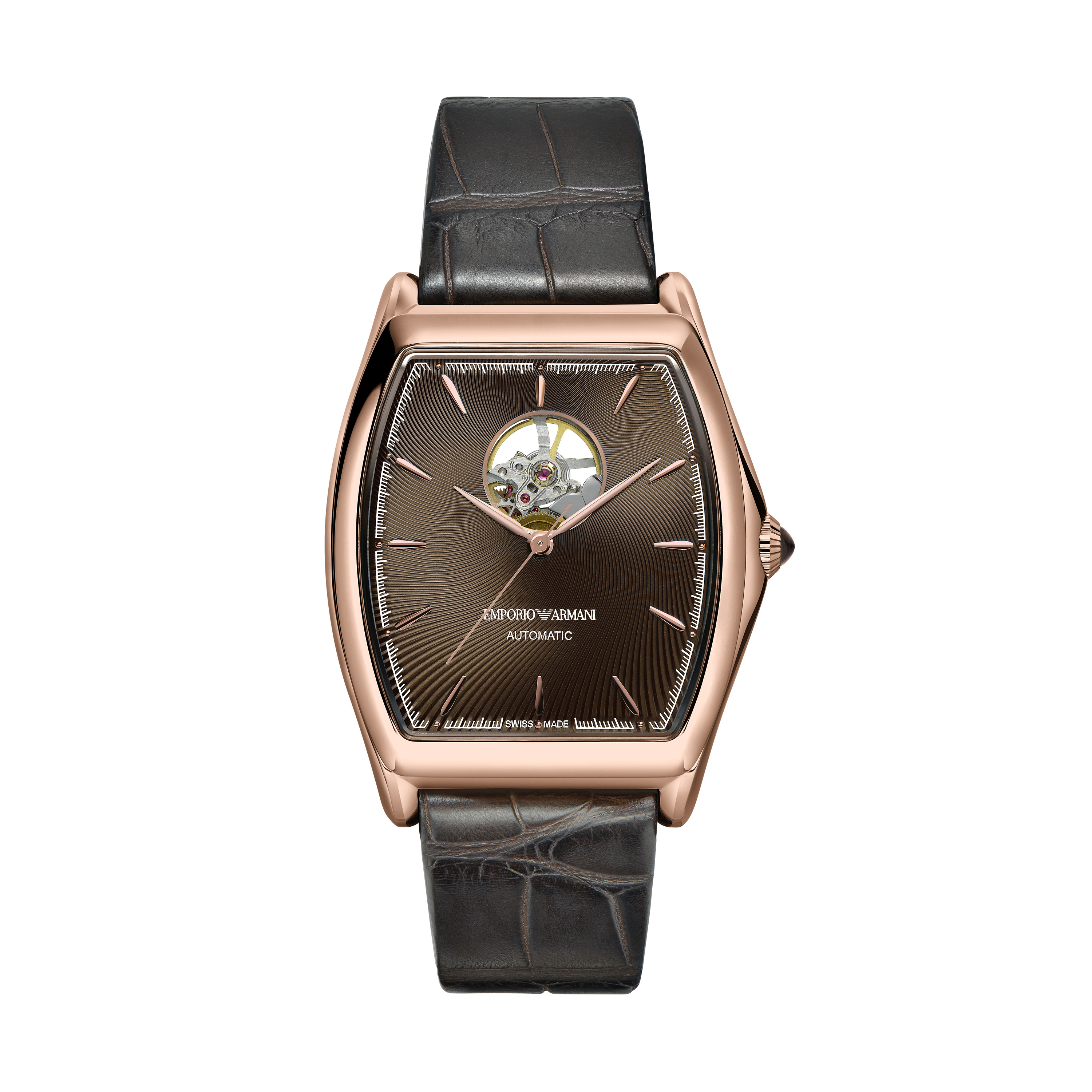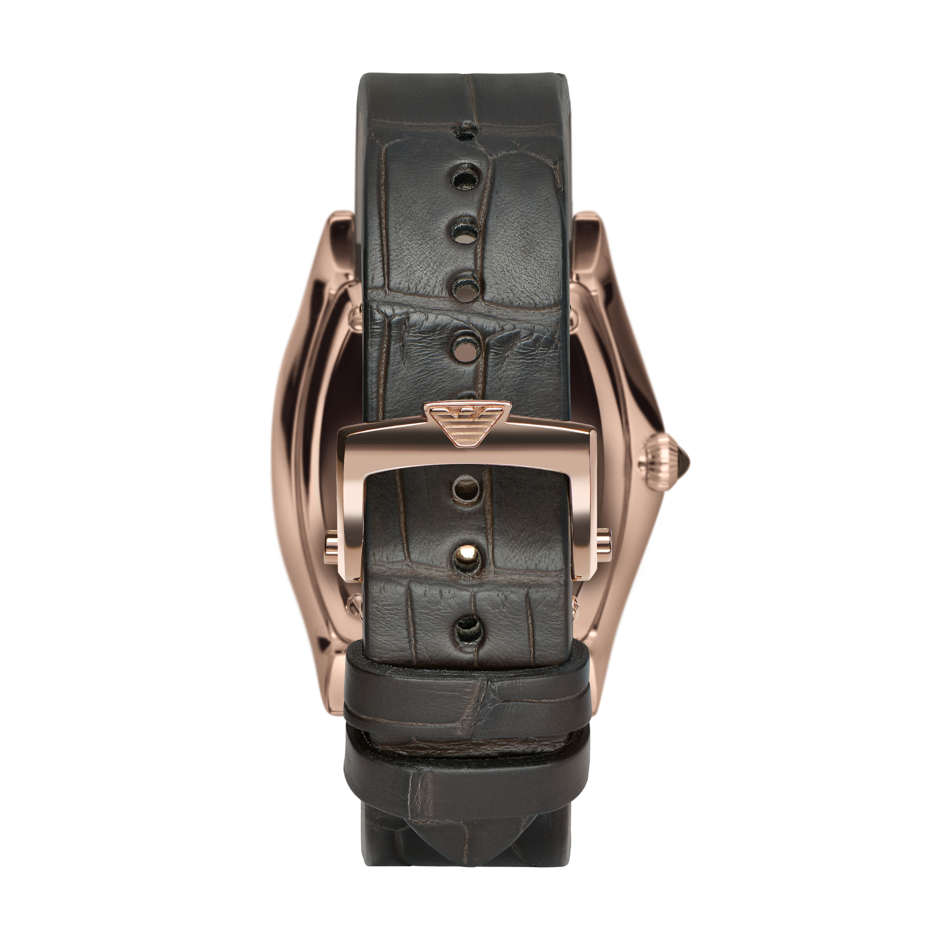 Il vetro zaffiro antiriflesso della cassa vi assicurerĆ la perfetta leggibilitĆ dell’ora. Meravigliose sono le lancette “dauphine” color oro rosa e gli indici a bastone, molto eleganti e “retrò”. Completa infine il tutto il cinturino in pelle di alligatore con chiusura dĆ©ployante color marrone realizzato nelle boutique italiane di Emporio Armani.