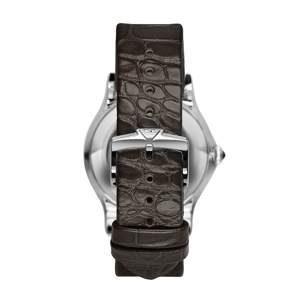Il vetro zaffiro antiriflesso della cassa vi assicurerà la perfetta leggibilità dell’ora. Meravigliose sono le lancette “dauphine” color oro rosa e gli indici a bastone, molto eleganti e “retrò”. Completa infine il tutto il cinturino in pelle di alligatore con fibbia ardiglione argentata realizzato nelle boutique italiane di Emporio Armani. Una garanzia di qualità.