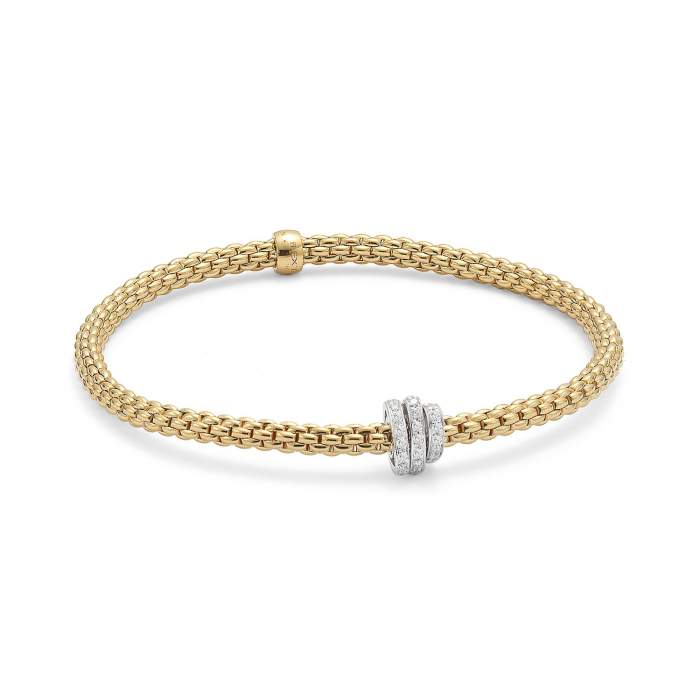 Realizzato appunto in oro giallo 18K, il bracciale è ovviamente provvisto della maglia “Flex’it”. Leggerissimo, il bracciale si fa apprezzare anche per i suoi elementi in oro bianco. Tre rondelle ellittiche impreziosite ognuna da undelizioso pavé di diamanti taglio brillante. Tutti insieme, i diamanti sviluppano una caratura totale di 0.31ct.