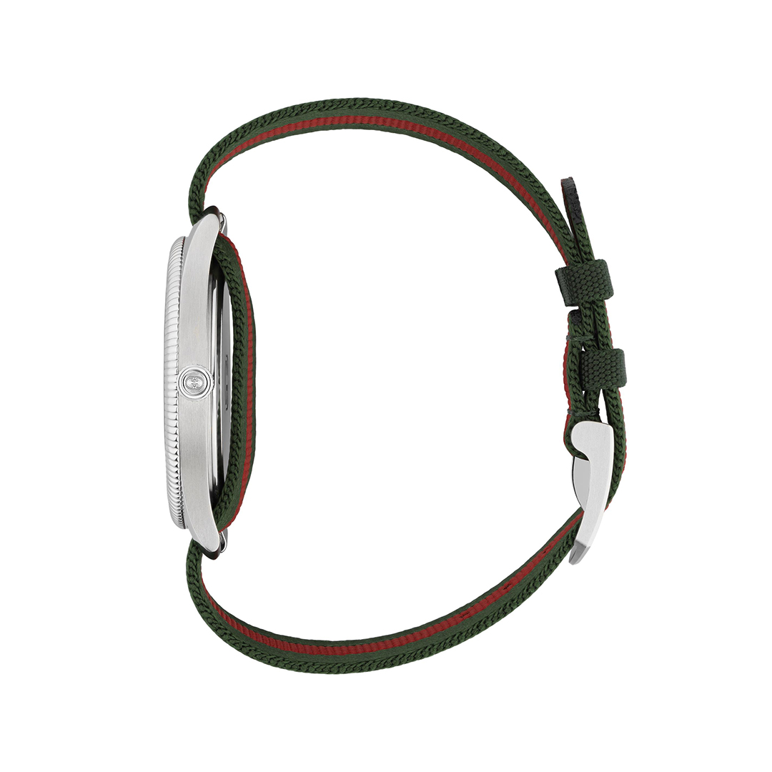 Dettagli quadrante: argento con Incrocio GG e logo Gucci, lancetta dei secondi color verde