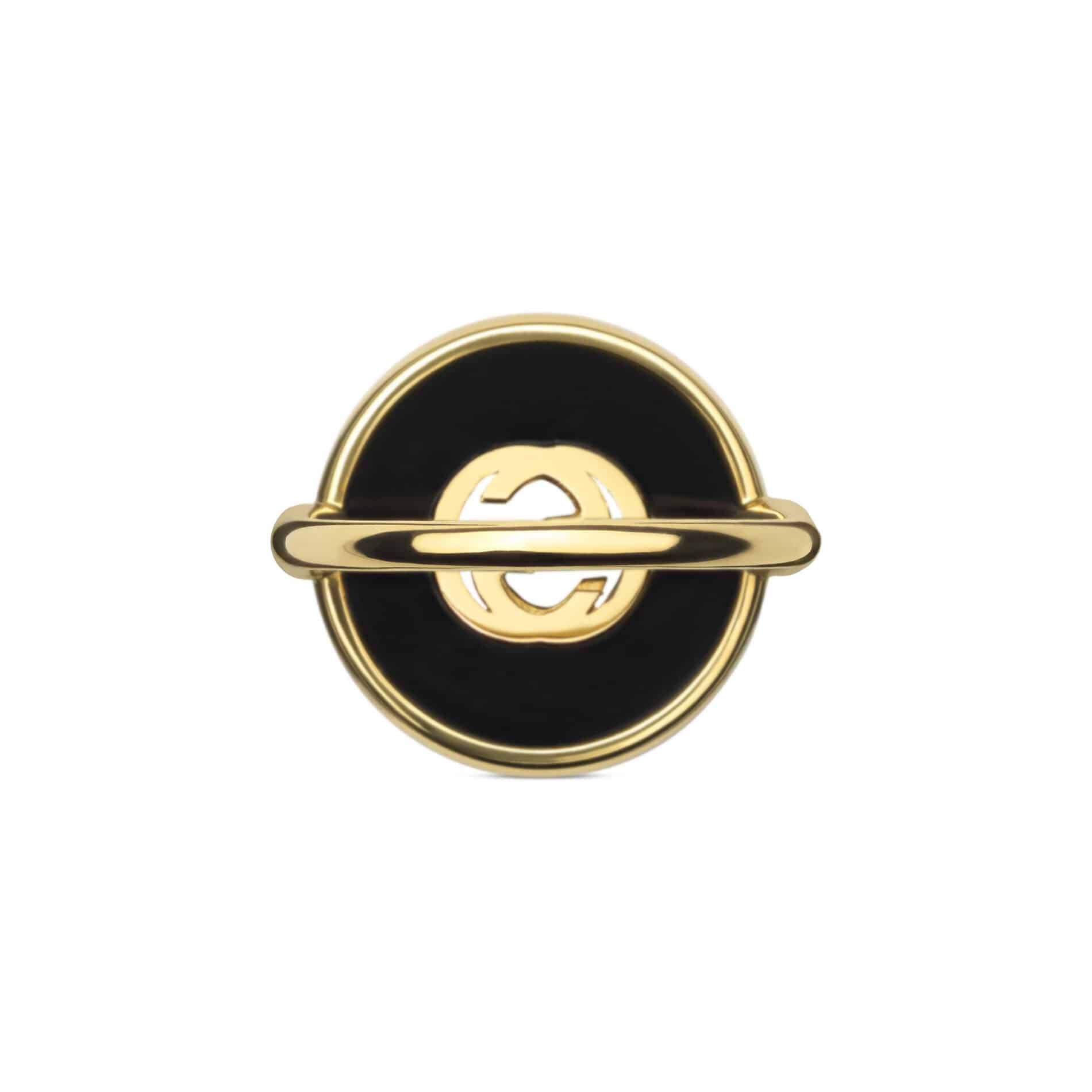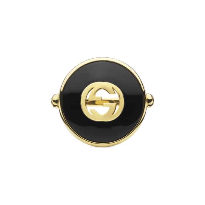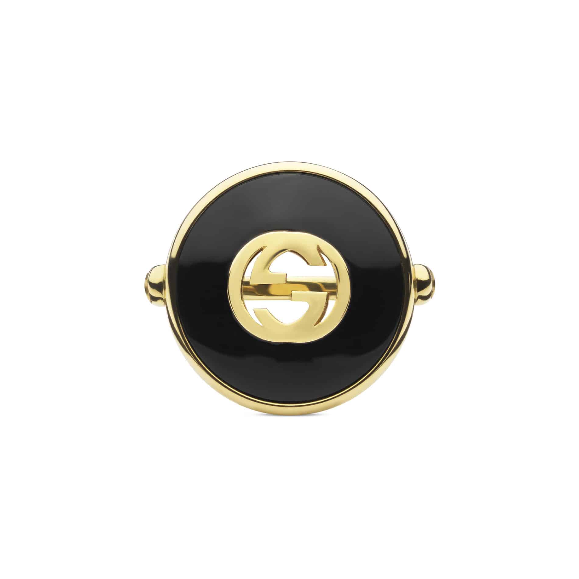 • Gucci Interlocking anello in oro giallo 18 carati con onice nero e diamanti.