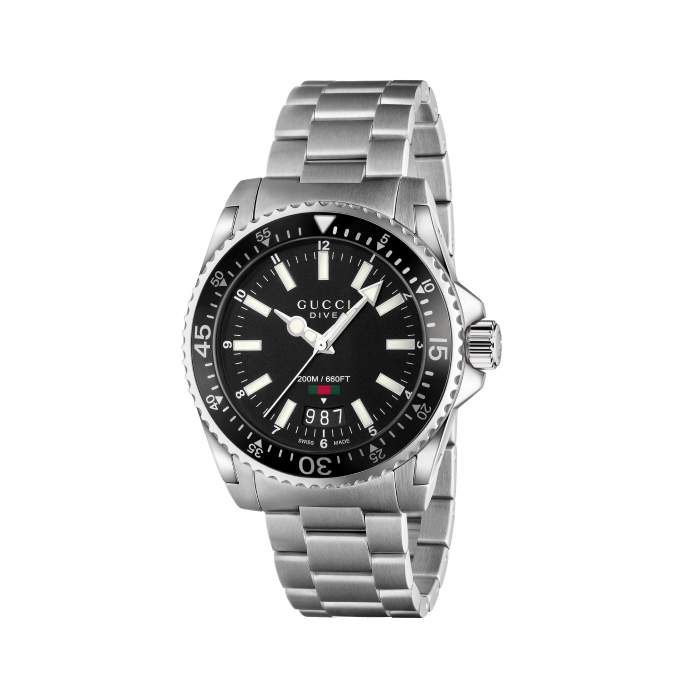 Orologio della collezione Gucci Dive Large, lo YA136301 si distingue per tanti particolari che lo rendono unico e inimitabile. La grande cassa in acciaio INOX da 40 mm di diametro è ben contornata dalla tipica lunetta degli orologi sportivi a cui questa linea di Gucci è dedicata. Nel quadrante nero opaco del Gucci Watches Dive YA136301 trova posto un bellissimo datario aperto e gli indici, come le lancette, sono realizzati in materiale luminescente. Il bracciale è realizzato acciaio INOX, e riprende quelle che sono le linee “aggressive” di un orologio specialistico qual è il YA136301.