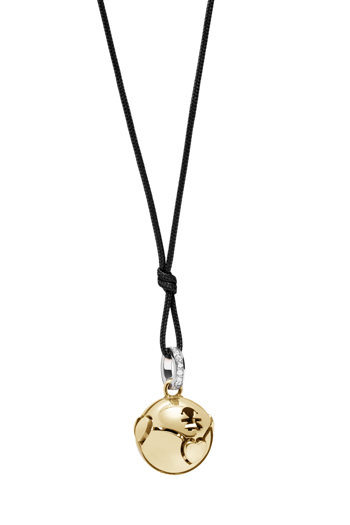 Meccanicamente parlando, il leBebe Suonamore Classici SNM030 si comporta esattamente come un sonaglino: realizzato interamente in oro giallo con contromaglia in oro bianco, la membrana interna di questo ciondolo con la forma del nostro pianeta emette un suono dolce e delicato. Un suono che il feto può udire grazie alla lunghezza della catena “rolò” abbinata. Da notare il piccolo pavé di diamanti apposto sulla contromaglia. Un preziosissimo dettaglio.