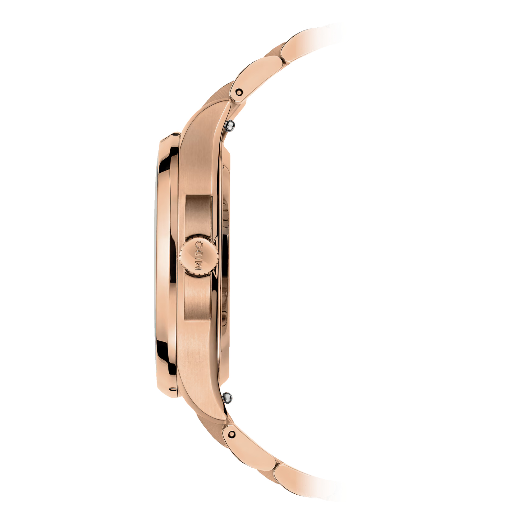 Mido Multifort TV 35 M049.307.33.296.00 è un orologio da donna accattivante e fuori dagli schemi. Un accessorio dallo stile retrò ed originale, reso ancor più importante dal calibro automatico con spirale in Nivachron, qui inserito in una nuova cassa da 35 mm con diamanti come indici. Una splendida variante in acciaio INOX PVD color oro rosa per un modello che Mido ha proposto per la prima volta nel 1973, ispirandosi appunto agli schermi “arrotondati” delle TV d’epoca.