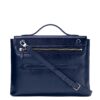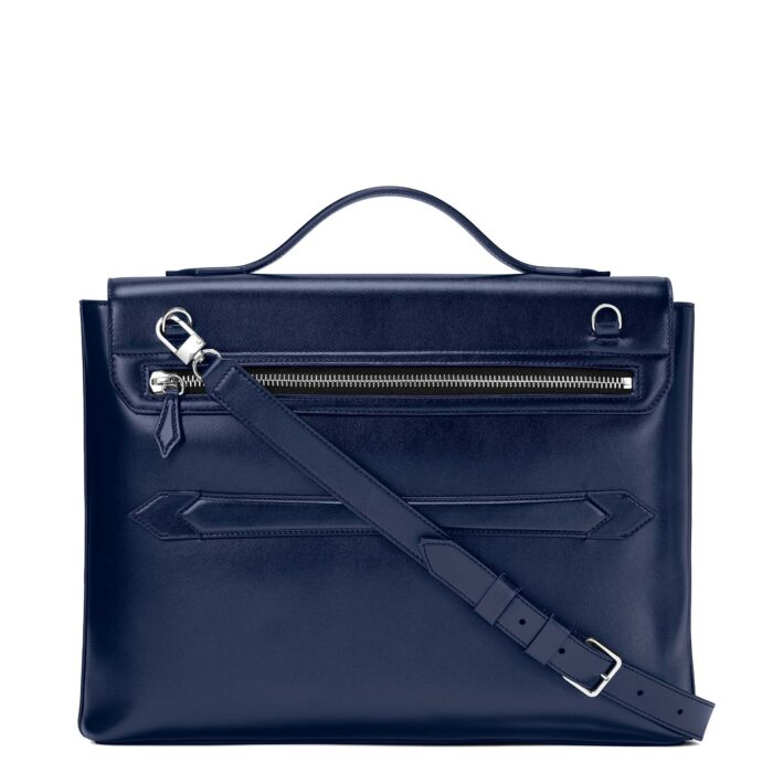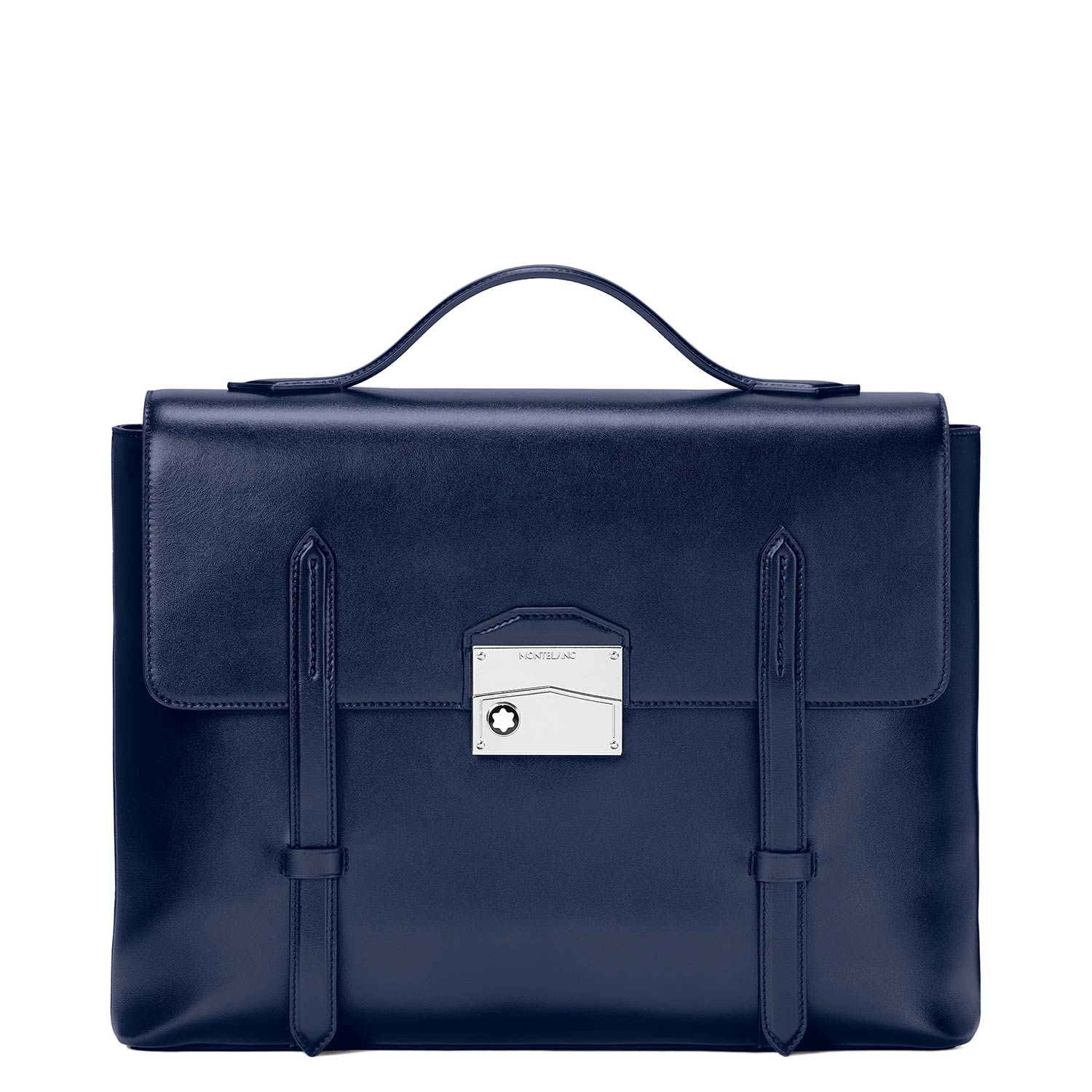 Ovviamente la pelle è trattata con concia al cromo, uno dei procedimenti più usati nei laboratori di tutto il mondo. La tintura passante permette inoltre che il colore esclusivo di questa linea penetri in maniera omogenea in tutta la superficie del pellame. Realizzata in una elegante tonalità di blu, la cartella si fa notare per le splendide impunture a forma di pennino. La stessa forma la troviamo anche sui cursori delle cerniere in metallo e sui manici in pelle. Un modo originale di Montblanc per richiamare il suo legame indissolubile con la scrittura.