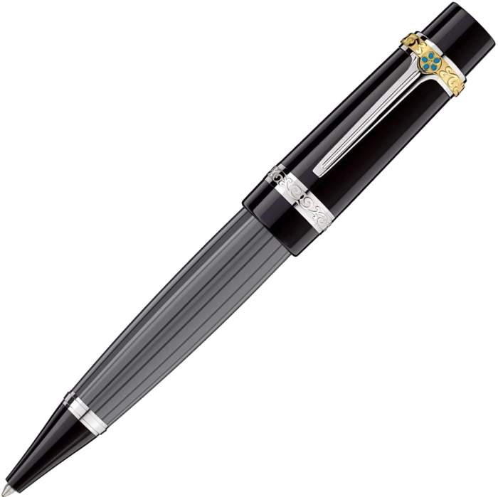 Qualitativamente parlando, questa penna sfera è un prodigio dell’artigianato Montblanc. Realizzata quasi interamente in pregiata lacca , il colore grigio scuro con lavorazione guilloché qui usato è molto singolare. Abbinato alle linee color nero, questo grigio vuole ricordare i pantaloni del tight. Ovvero il completo maschile molto in voga ai tempi di Balzac, che era sempre molto attento alle mode. Un gentleman d’altri tempi, se così vogliamo dire!