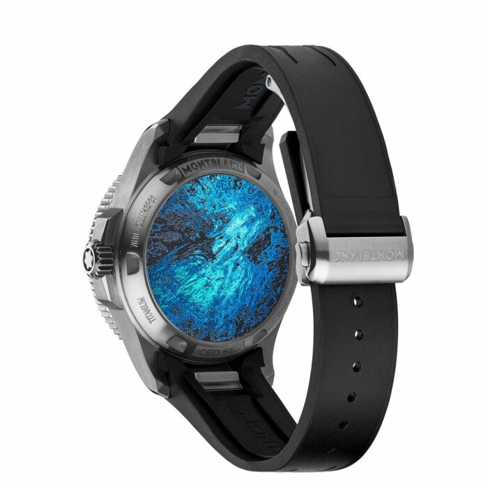 Per evidenziare il legame con i ghiacciai, Montblanc ha inserito due riferimenti molto “glaciali”. Il più evidente è sicuramente il quadrante blu realizzato con la tecnica ancestrale “gratté-boisé”, la cui texture ricorda molto la superficie ghiacciata del “Mer de Glace” che si trova sul Monte Bianco. L’altro riferimento è inciso con uno speciale laser 3D sul fondello in titanio, ed è la rappresentazione di come appare guardare sotto la superficie congelata dei ghiacciai.