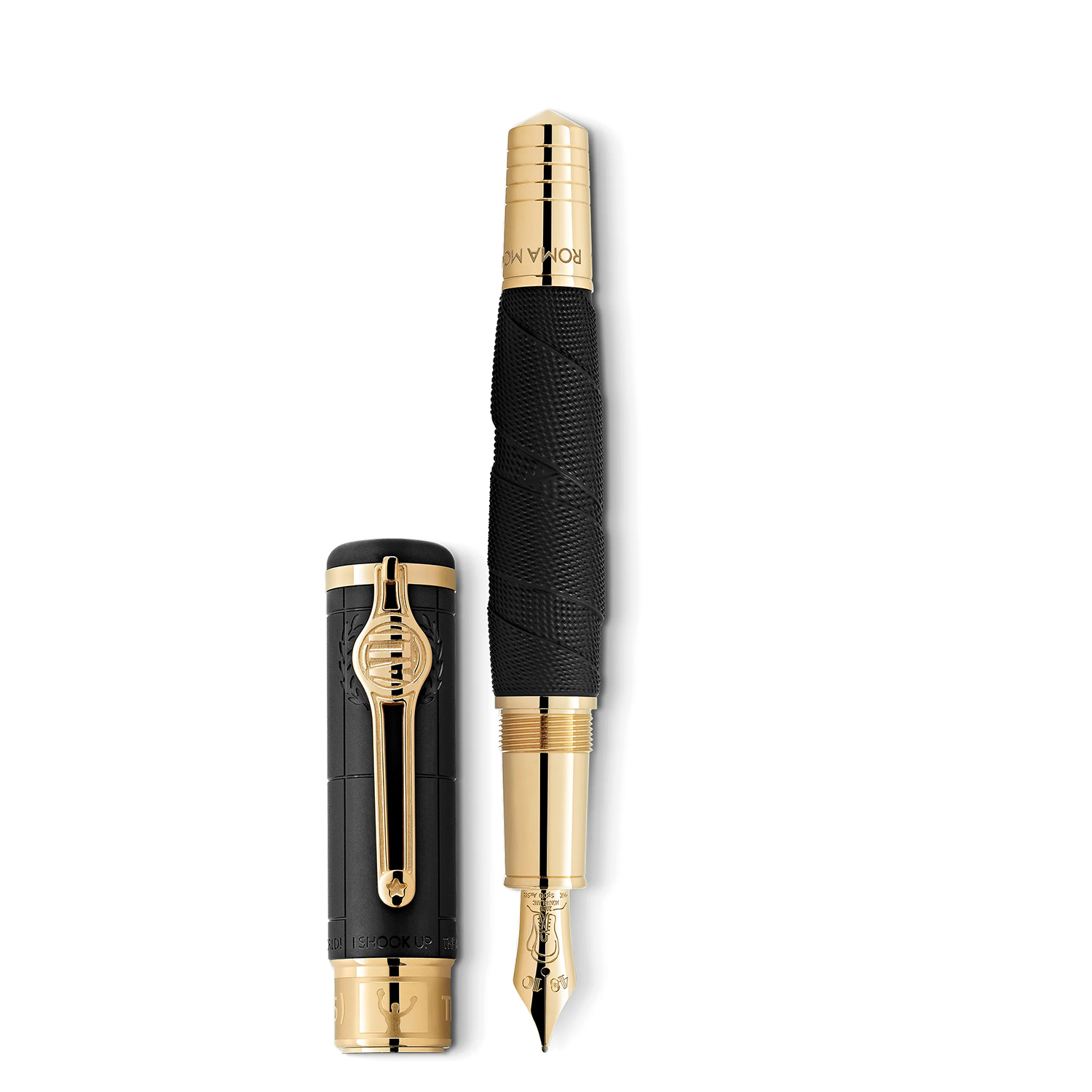 Realizzata interamente in pregiata resina color nero, le forme della penna si dividono sostanzialmente in due parti. Il corpo è adornato come se fosse ricoperto dalle fasce che si indossano sotto i guantoni, così come ricordano anche le trame intessute nella resina Montblanc. Il cono a punta color oro giallo riprende la storica affermazione “Vola come una farfalla, pungi come un ape” tramite la sua forma inusuale. Sempre sul cono sono incise sia quattro linee (che rappresentano le corde del ring di pugilato) e sia due date e luoghi molto importanti nella storia di Alì: Roma 1960 (vittoria ai Giochi Olimpici) e Miami 1964 (prima conquista del titolo mondiale dei pesi massimi). Da notare che l’anno delle Olimpiadi di Roma è riportato appunto in numeri romani.
