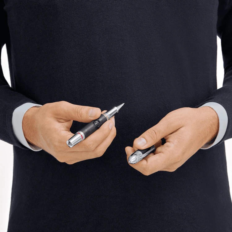 Il primo particolare che si nota subito è la forma della penna. Una forma che ricorda la mitica “monorotaia” di Disneyland, primo grande parco a tema dedicato alle opere disneyane. Il tutto realizzato con la pregiata resina di Montblanc, impreziosita dagli ormai classici dettagli color platino.