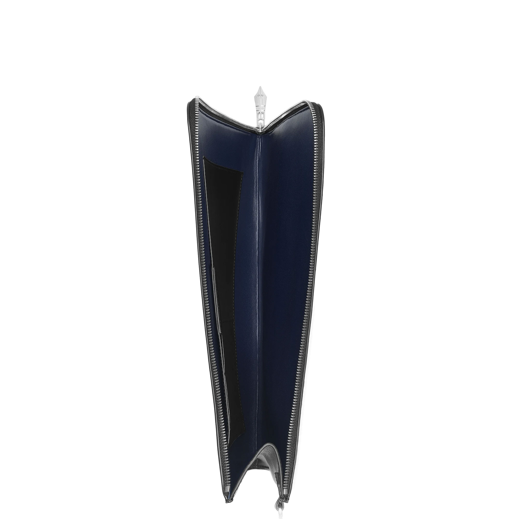 Ovviamente la pelle è trattata con concia al cromo, uno dei procedimenti più usati nei laboratori di tutto il mondo. La tintura passante permette inoltre che il colore esclusivo di questa linea penetri in maniera omogenea in tutta la superficie del pellame. Da notare che questo portadocumenti è color nero con cuciture in rilievo. Le impunture richiamano la forma del pennino di una stilografica. La stessa forma del cursore della chiusura a cerniera di questo portadocumenti.