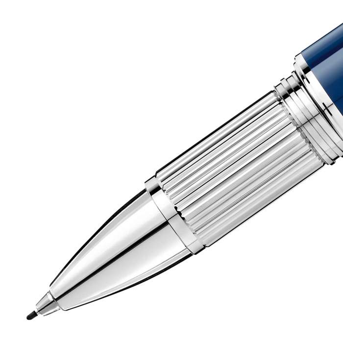 Il primo particolare che salta subito agli occhi di queste penne è sicuramente la punta del cappuccio. Realizzata in pregiata resina trasparente, all’interno è inserito il logo di Montblanc che “fluttua” in una cupola blu. Il tutto è stato concepito per ricreare in piccolo la Terra vista dallo spazio, con il logo di Montblanc che rappresenta uno dei cinque continenti.