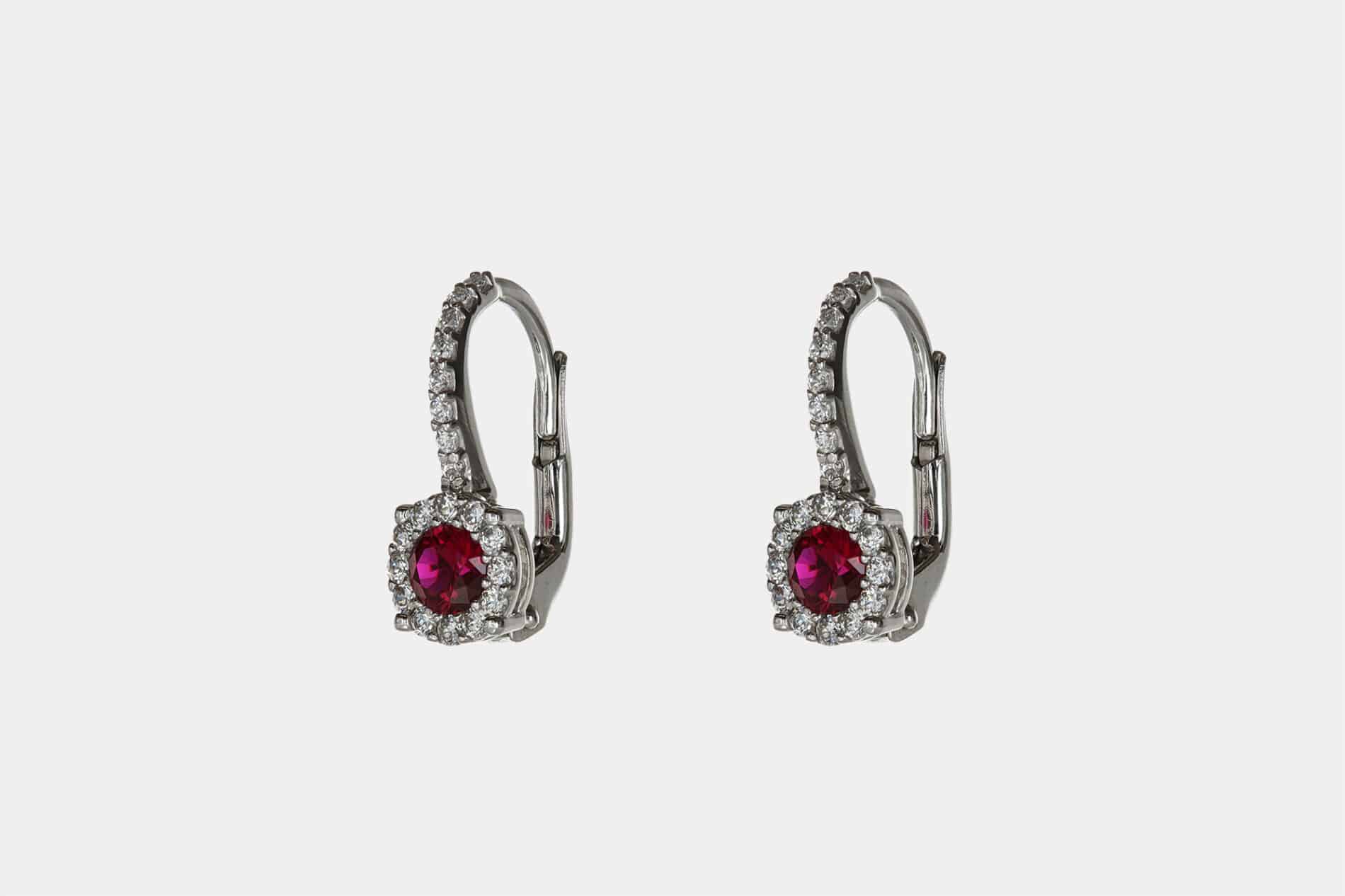 Orecchini oro bianco monachella zirconi rossi 6.5 mm sono gioielli di oreficeria dal fascino unico. Un classico rivisitato in moltissime soluzioni, qui realizzati in oro bianco con due zirconi rossi taglio “tondo brillante” centrali e tutt’attorno un pavĆ© di zirconia cubica bianca.