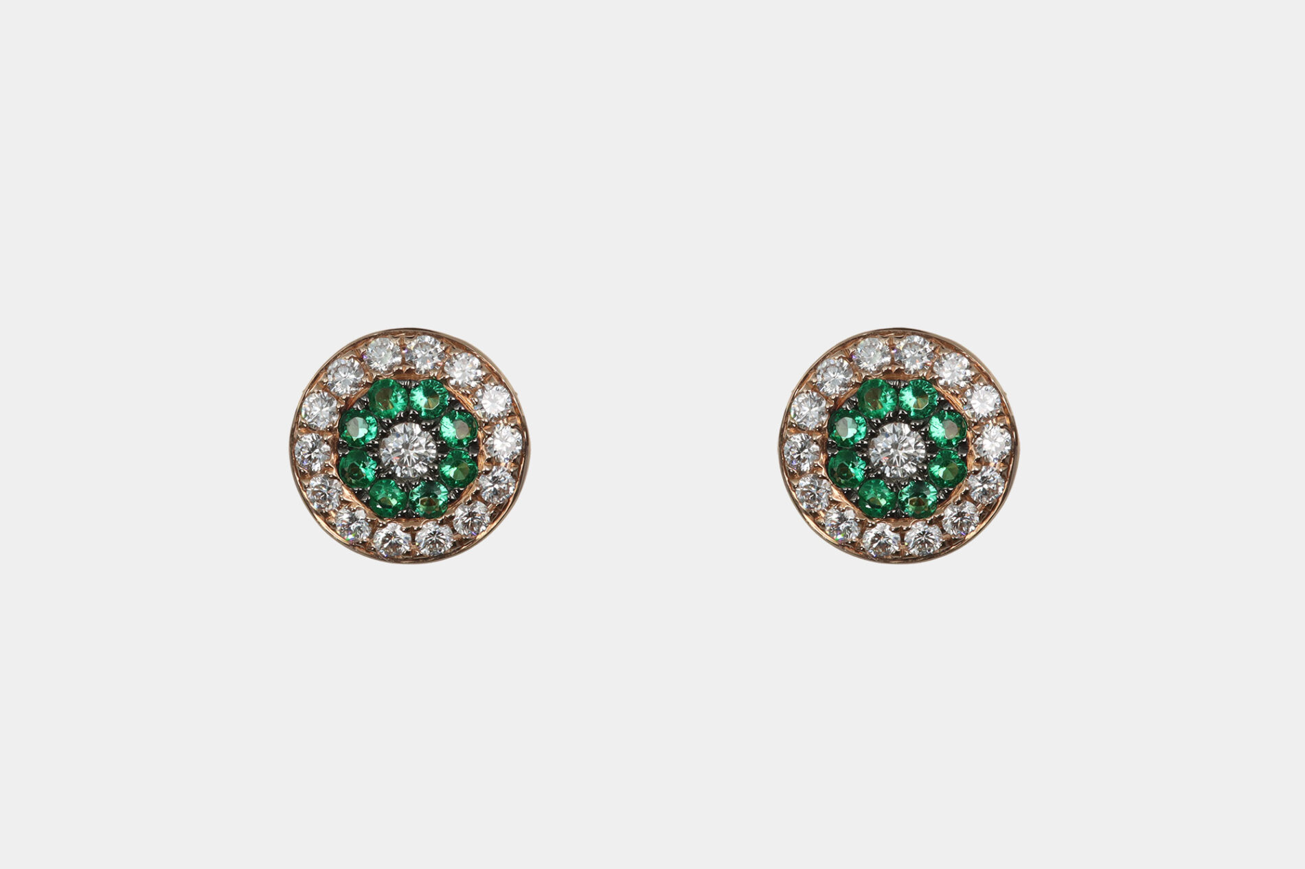 Semplici, eleganti e dalla lucentezza incredibile: questi sono gli orecchini tondi con pavé di smeraldi e diamanti in oro rosa della Gioielleria Casavola di Noci (BA).