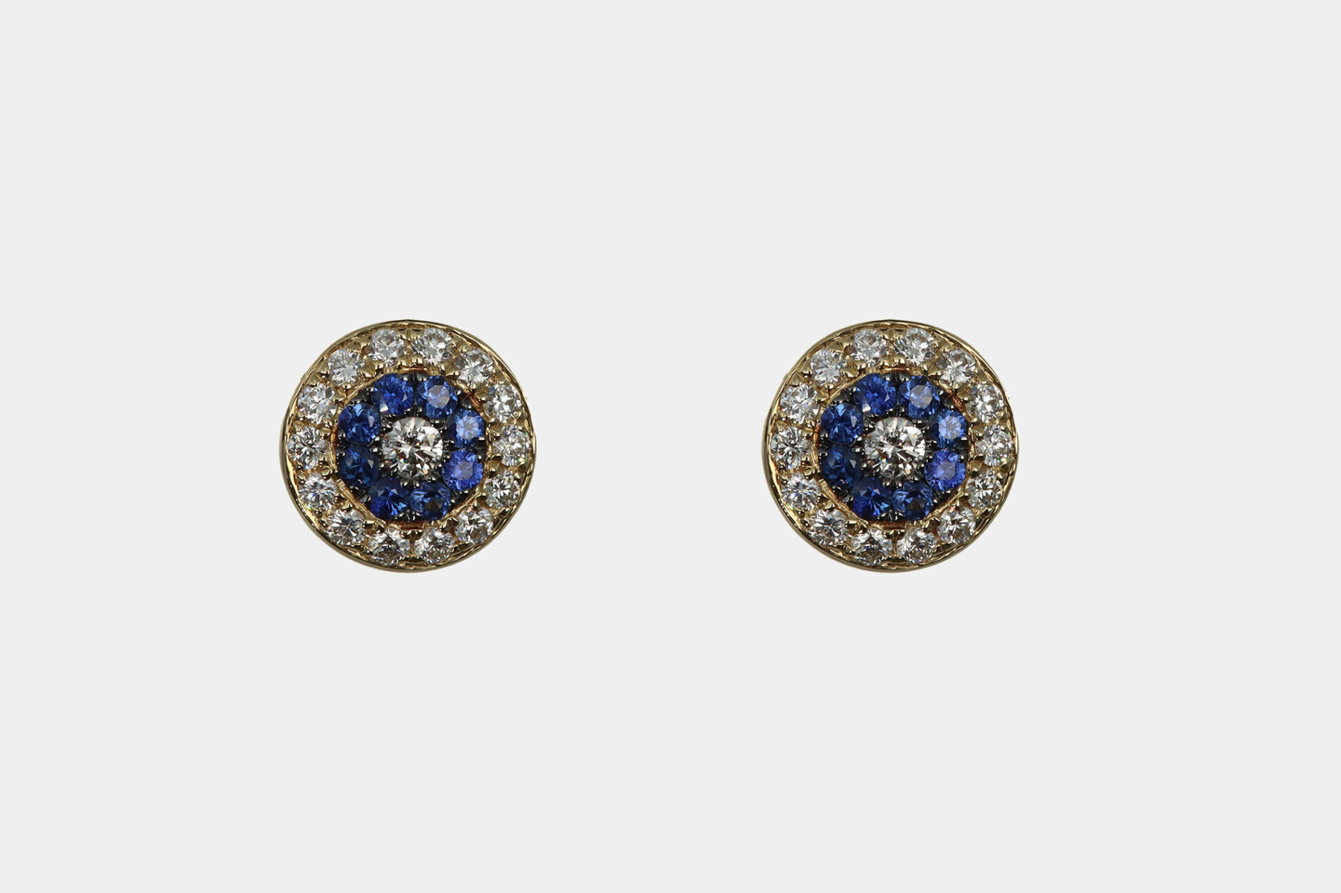 Orecchini tondi in oro giallo con pavé di zaffiri e diamanti taglio tondo brillante realizzati dalla Gioielleria Casavola di Noci (BA).
