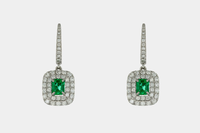 Orecchini pendenti halo smeraldo Prestige White – Luminose suggestioni cromatiche