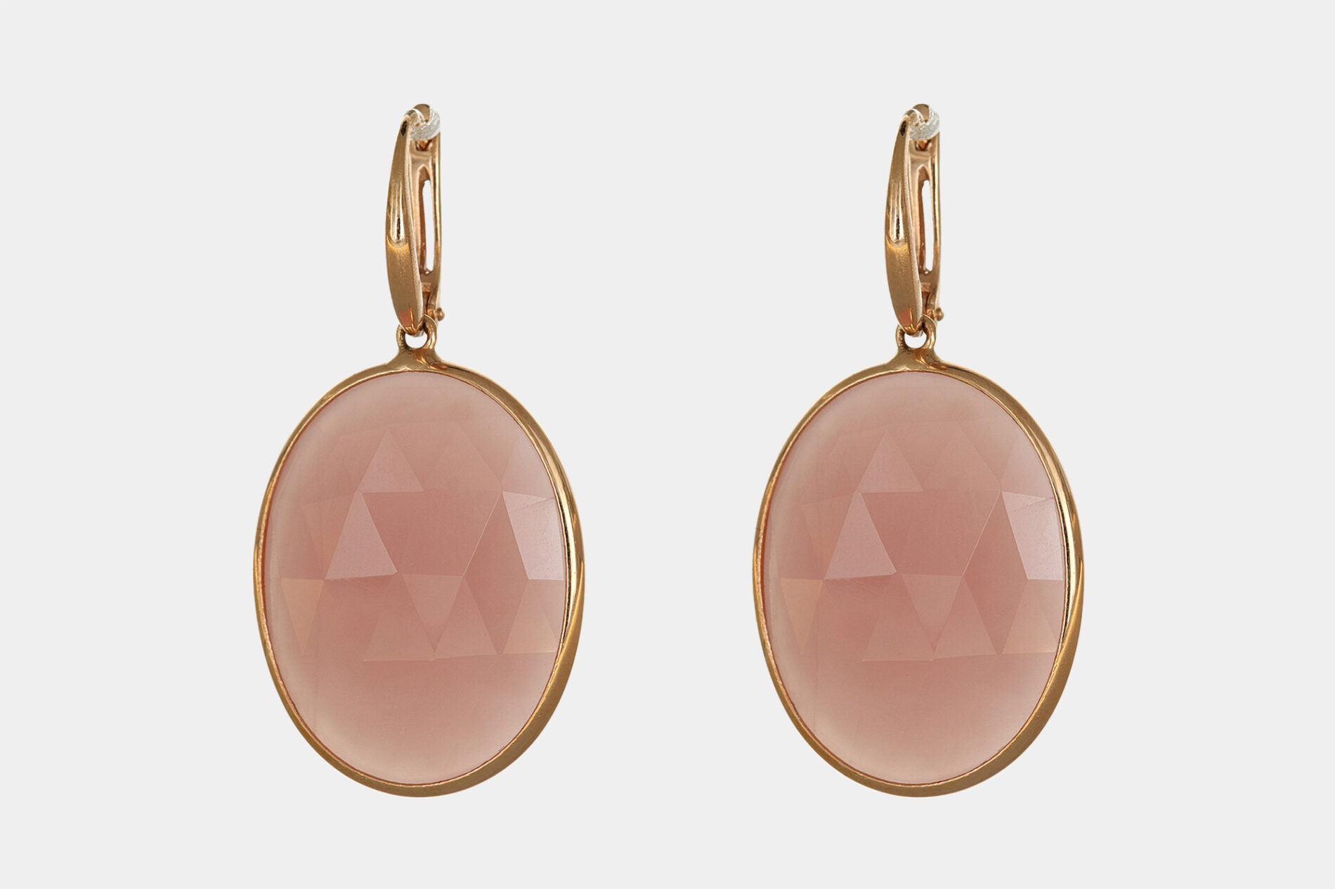 Orecchini pendenti ovali oro rosé con quarzo rosa sono gioielli di oreficeria dal fascino unico. Dei grandi classici che non passano mai di moda, qui realizzati in prezioso oro rosa/rosé 18 carati di forma ovale con due grandi quarzi rosa sfaccettati che seguono le linee degli orecchini.