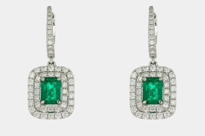 Orecchini di forma rettangolare con smeraldi e diamanti bianchi della linea Prestige by Gioielleria Casavola di Noci (BA).