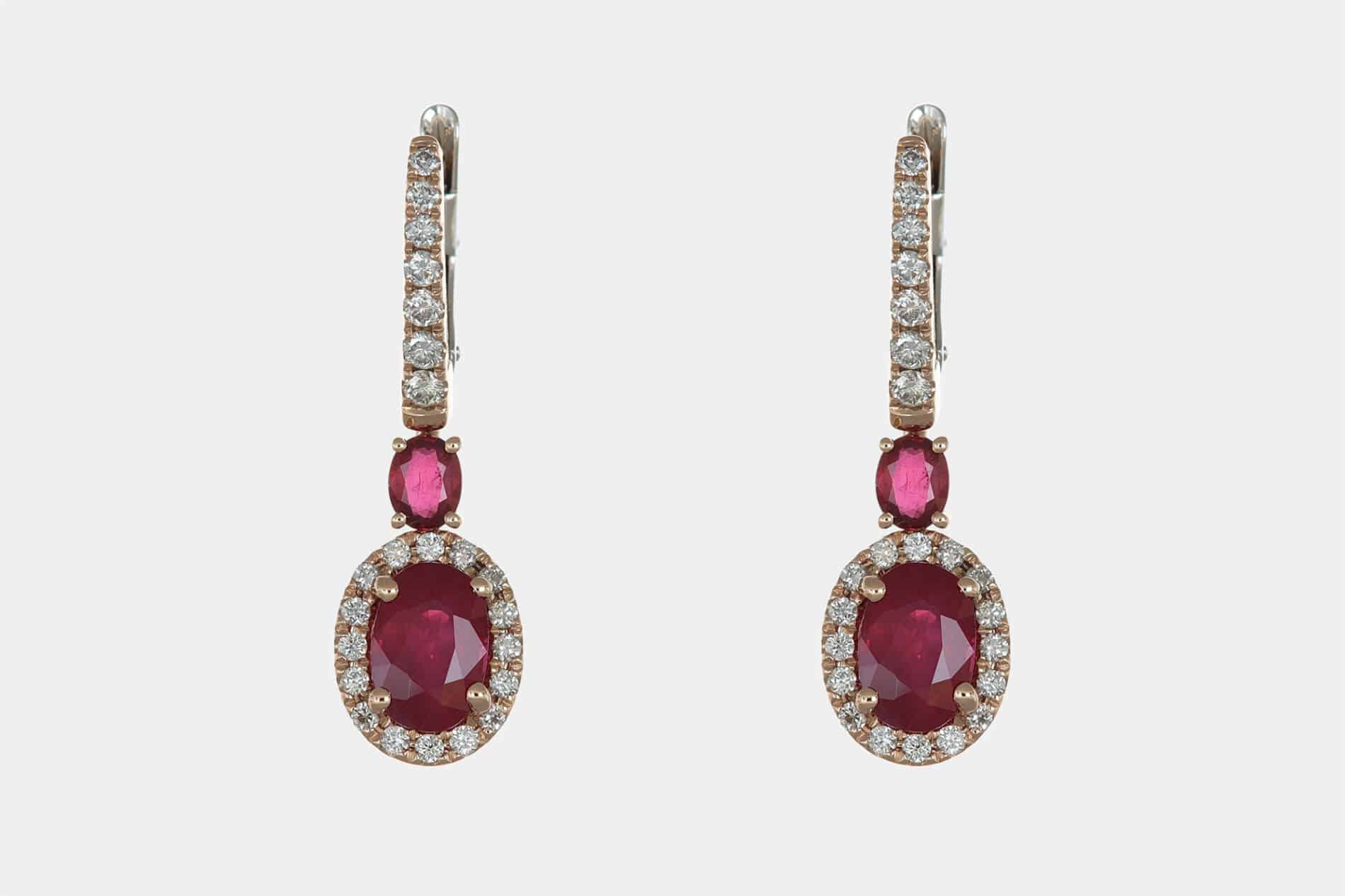 Generalmente, questi gioielli si sviluppano tutt’attorno alla pietra centrale. Una pietra taglio ovale, ovviamente. Ma se il designer è molto bravo, può anche realizzare gioielli di forma usando pietre di taglio diverso. Ma non è questo il caso degli orecchini pendenti rubini ovali Prestige Rosé.