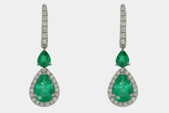 Generalmente, i gioielli a forma di goccia si sviluppano tutt’attorno alla pietra centrale. Una pietra taglio goccia, ovviamente. Ma se il designer è molto bravo, può anche realizzare gioielli di forma usando pietre di taglio diverso. Ma non è questo il caso degli orecchini pendenti smeraldi goccia Prestige White.