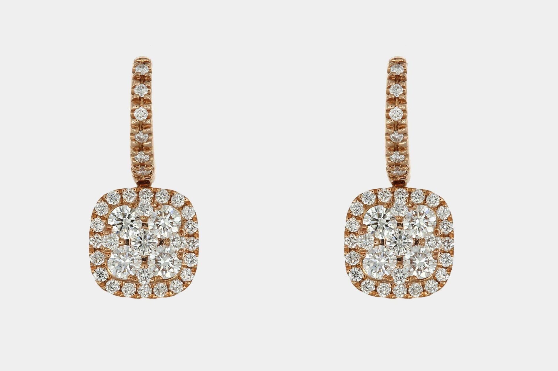 Orecchini quadrati pendenti Liberty Rose sono tra i gioielli più innovativi e desiderati della Gioielleria Casavola di Noci (BA). Un paio di orecchini pendenti in oro rosa con diamanti realizzati interamente dai fratelli Dario e Fabio Casavola, qui nella doppia veste di gioiellieri e gemmologi.