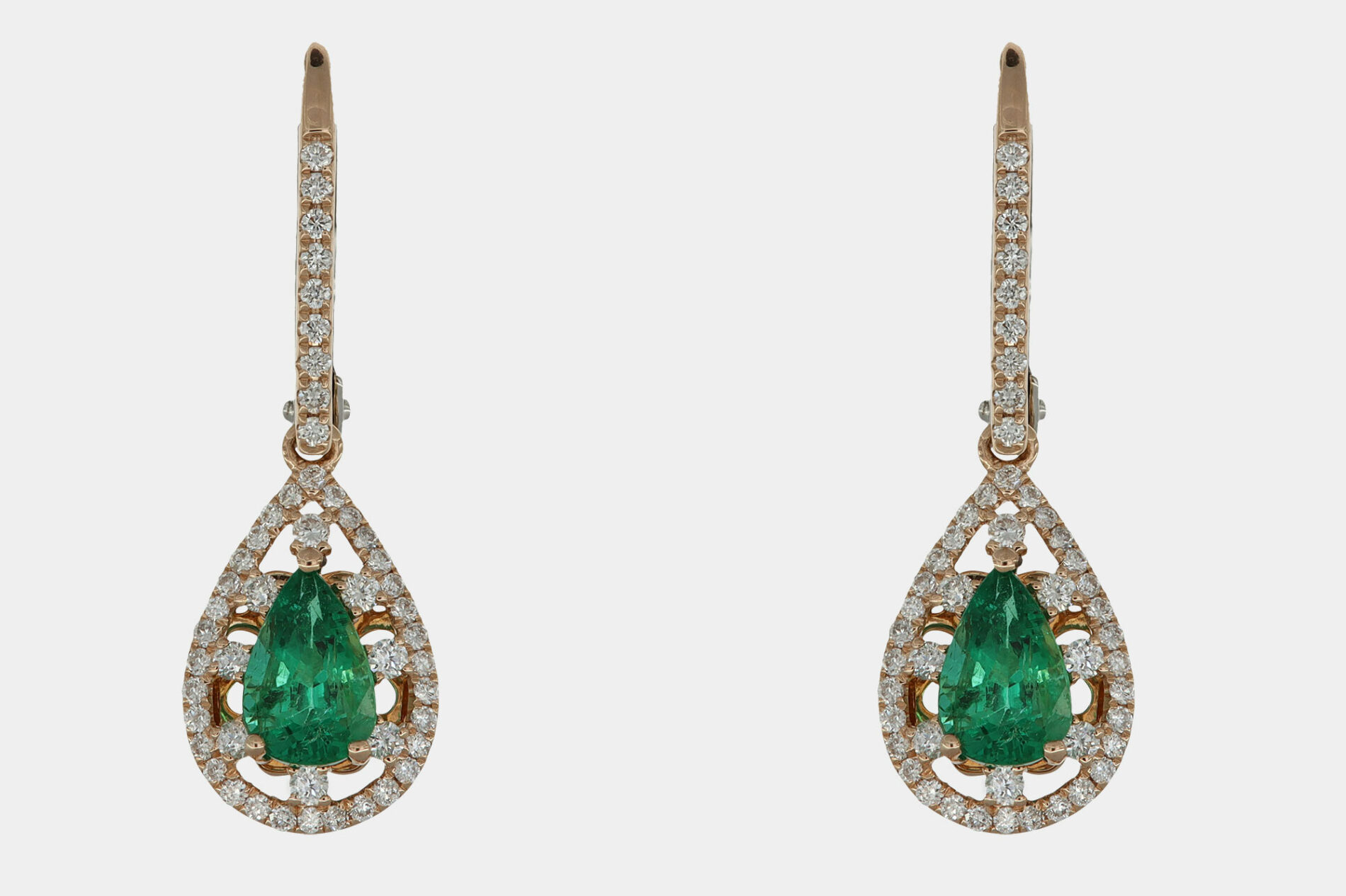 Orecchini smeraldo goccia Aquilegia Nature Rose è un gioiello ispirato alle forme ed ai colori della natura. Dei gioielli “di forma” interamente in oro rosa su cui spiccano degli smeraldi taglio “goccia” contornati da un pavé di diamanti. Un gioiello dalle caratteristiche uniche ed inconfondibili. Un’opera della Gioielleria Casavola di Noci (BA).