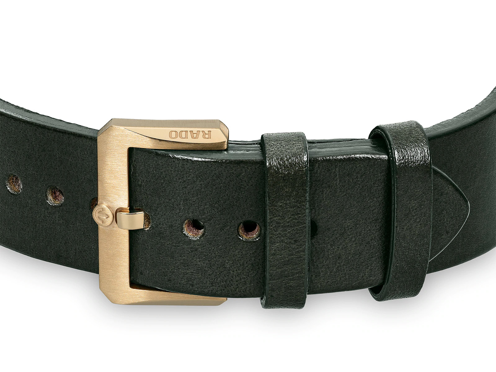 La ghiera color verde dell’orologio è invece in ceramica hi-tech. Brevettato verso la fine del 20mo secolo, questo materiale è molto più resistente della normale ceramica. Antigraffio ed anallergica, fu Rado ad introdurre l’uso di questa ceramica in orologeria.