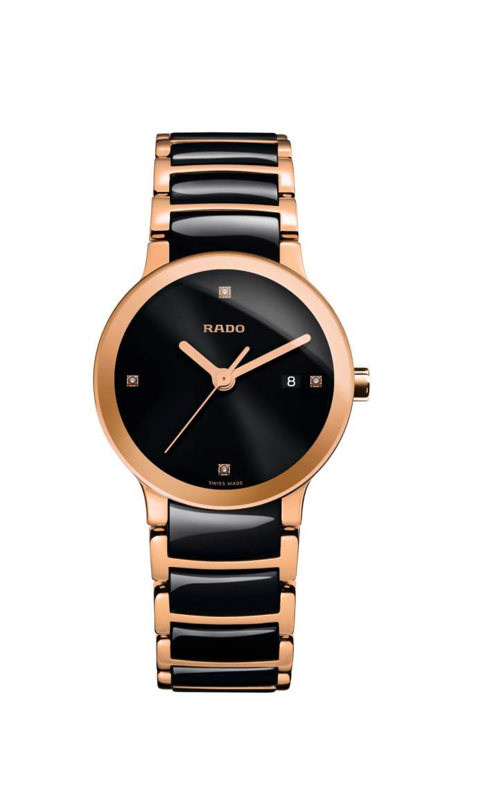 Semplice ed elegante, il Rado Centrix Diamonds R30555712 è un orologio pensato soprattutto per i polsi delle signore. La cassa in acciaio INOX PVD bicolore nero/oro rosa misura soltanto 28 mm x 6,7 mm, ed è quindi perfetta per chi ama indossare orologi piccoli. La combinazione nero/oro rosa di cassa e quadrante ben si abbina con la lucentezza dei quattro diamanti da 0,009 carati che Rado® ha utilizzato come indici del Centrix R30555712. Incassato nel Rado Centrix Diamonds R30555712 abbiamo un calibro ETA 956.112, movimento al quarzo prodotto dalla famosa azienda svizzera di Grenchen. Azienda che, proprio come la Rado, fa parte del Gruppo Swatch, uno dei leader del settore.