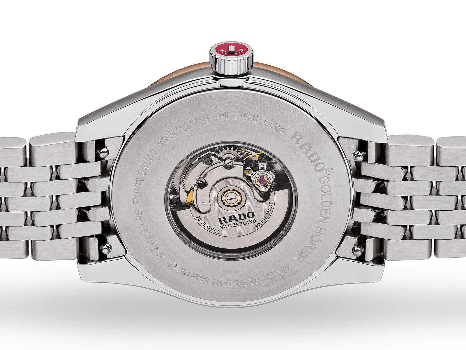 La ghiera è invece in Ceramos, un materiale realizzato solo ed esclusivamente da Rado. Materiale nato dalla combinazione tra la ceramica high-tech di Rado ed il metallo, il Ceramos conserva entrambe le caratteristiche di questi materiali. Aggiungendo però una delicatissima lucentezza color oro rosa, resa possibile proprio grazie a Ceramos.