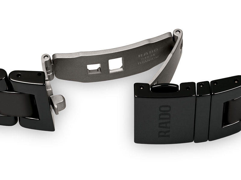 Le piccole parti del bracciale sono infine in titanio. Materiale coerente con la filosofia Rado, il titanio qui usato è ipoallergenico e molto robusto. E come da capacità innata di questo componente, è ultra-leggero.