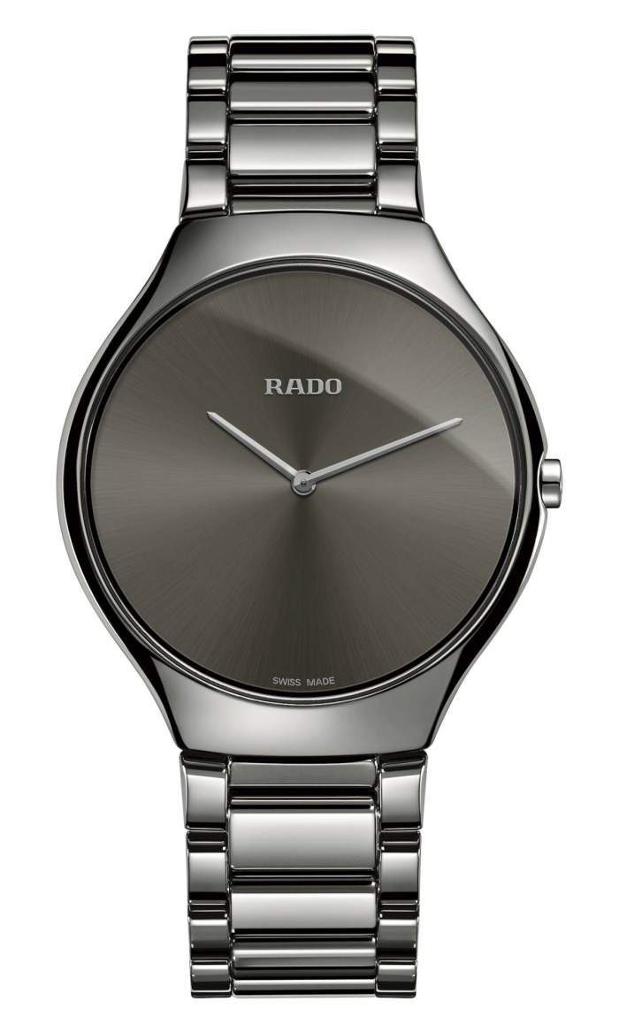 Realizzato quasi interamente in ceramica hi-tech al plasma, il True Thinline R27955122 è quindi estremamente resistente ai graffi, ipoallergenico e leggero. Queste caratteristiche, tipiche della normale ceramica hi-tech inventata da Rado negli anni 80, vengono amplificate dal processo di riscaldamento al plasma, che brucia l’ossido di zirconio bianco trasformandolo in carburo di zirconio. Questo conferisce alla ceramica hi-tech al plasma della Rado un aspetto metallico e lucido davvero gradevole e ben visibile. E nei modelli Thinline, la linea di orologi più sottili realizzati da Rado, le caratteristiche di questi materiali innovativi risaltano subito all’occhio.