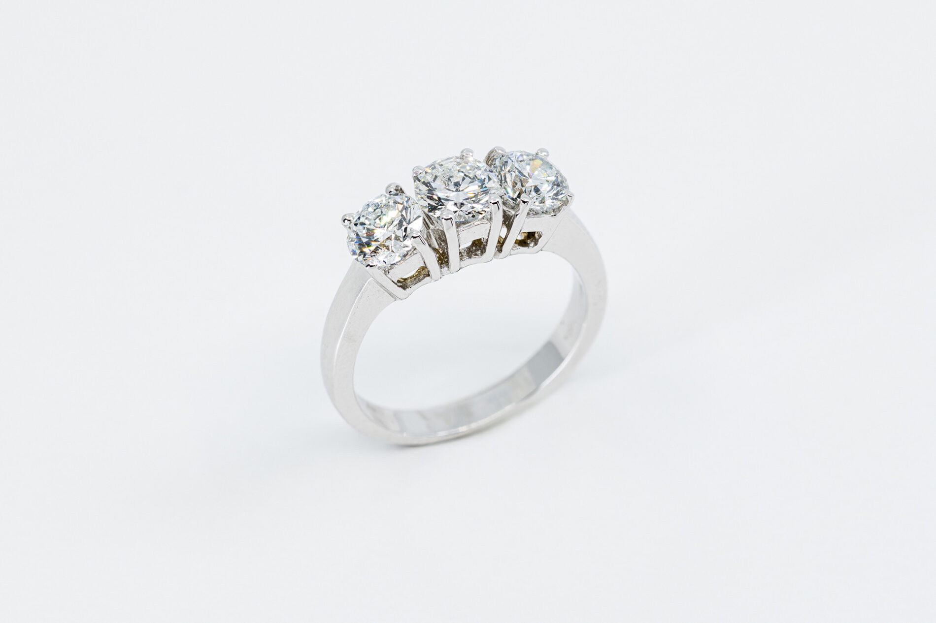 Anello trilogy con diamanti certificati in oro bianco 18 carati realizzato dalla Gioielleria Casavola di Noci (BA).