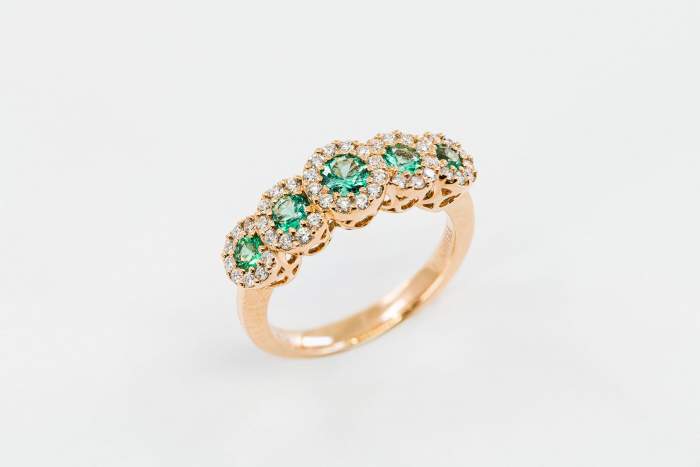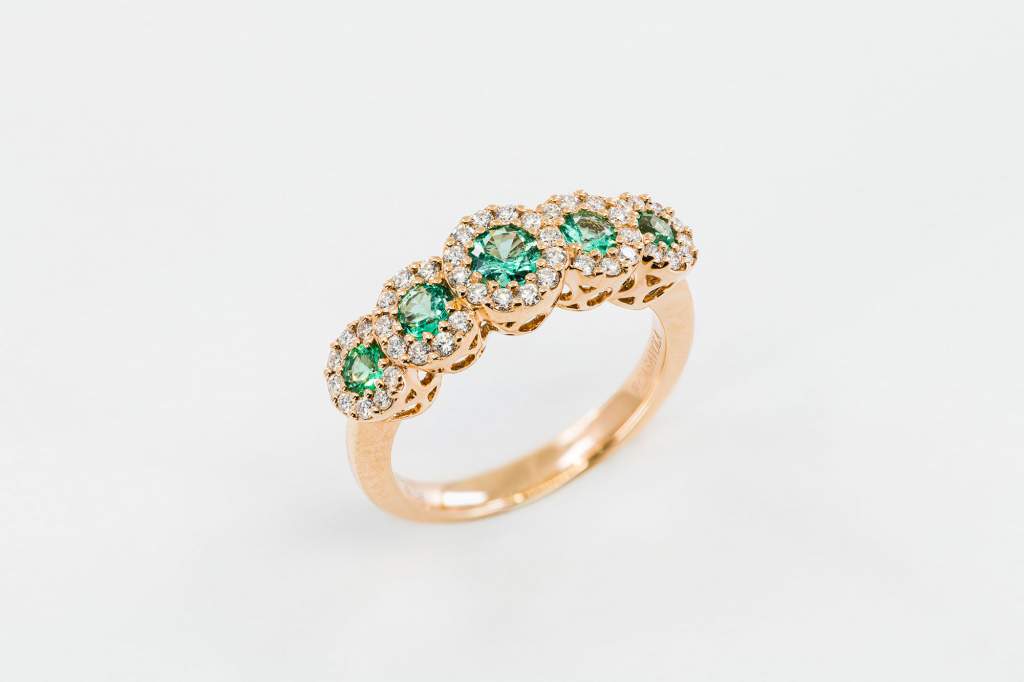Anello Veretta con 5 smeraldi e pavé di diamanti bianchi in oro rosa realizzata dalla Gioielleria Casavola di Noci (BA).