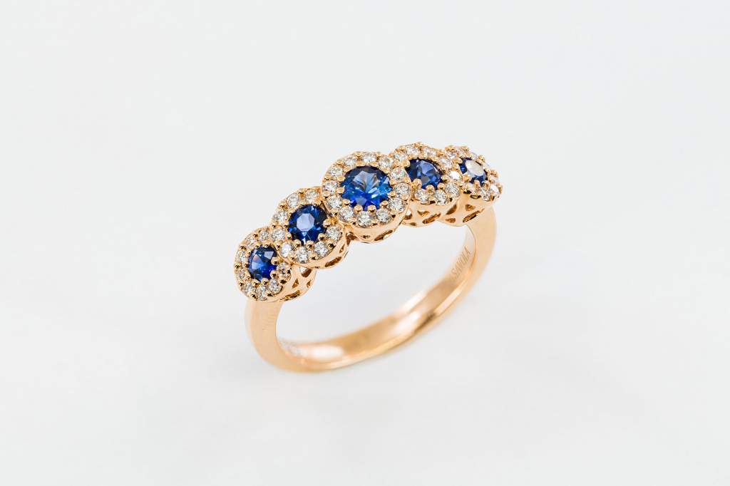 Veretta 5 zaffiri pavé rosé è uno degli anelli da fidanzamento e proposte di matrimonio più originali e sbarazzini della nostra gioielleria. Un anello con ben cinque zaffiri dalla linea dinamica e giovanile. Qui impreziosito da tanti piccoli pavé di diamanti bianchi.